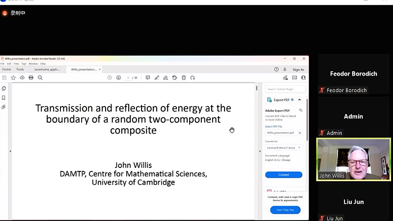 针对有机半导体薄膜应变和时间相关力学特性评估,Steve Bull教授着重介绍了在玻璃基板上使用纳米压痕法对100-300nm涂层样品开展的相关实验研究。针对能量在复合材料边界上的传递过程,John R. Willis教授着重讲解如何计算传入复合材料的平均能流和从边界反射的平均能流。