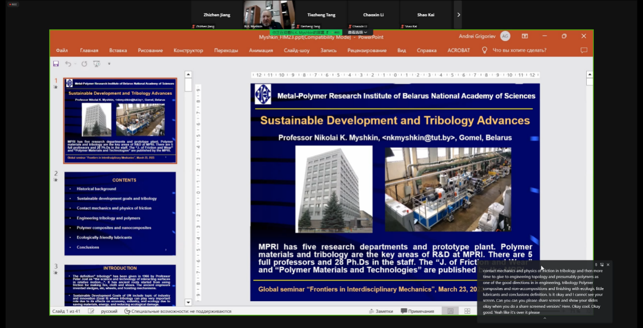 2023年3月20日、3月23日晚上19:00,HAHA体育“力学交叉融合”全球前沿学科系列讲座第5期和第6期分别在线上召开。讲座先后邀请俄罗斯科公司教授Elena V. Torskaya开展了主题为“Frictional Contact of Coated Solids”的学术讲座、白俄罗斯国家科公司院士Nikolai K. Myshkin开展了主题为“Sustainable Development and Tribology Advances”的学术讲座。