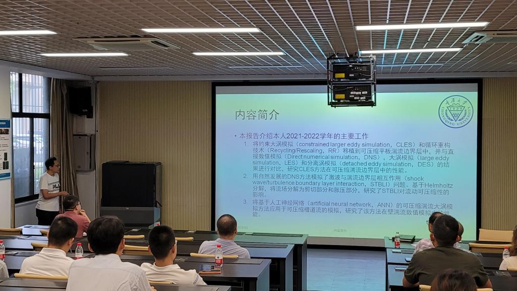 在第一个报告中,江舟老师简要介绍了个人近年科研成果,报告主要围绕“可压缩平板边界层数值模拟”、“激波湍流相互作用机理”和“基于人工神经网络的可压缩湍流大涡模拟方法”三个主要方面开展。