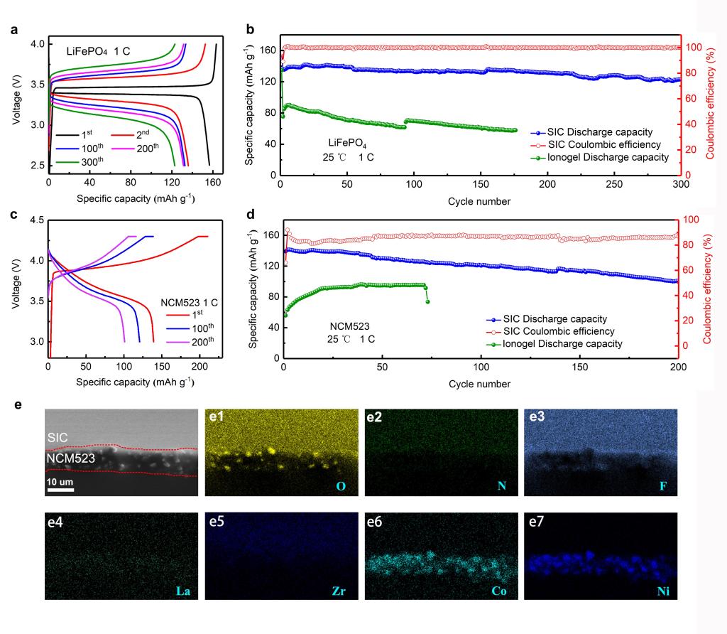 图2 (a) LiFePO4固态电池的容量-电压曲线. (b) LiFePO4固态电池的循环. (c) LiNi0.5Co0.2Mn0.3O2固态电池的容量-电压曲线. (d) LiNi0.5Co0.2Mn0.3O2固态电池的循环. (e) SIC/NCM523界面SEM图.