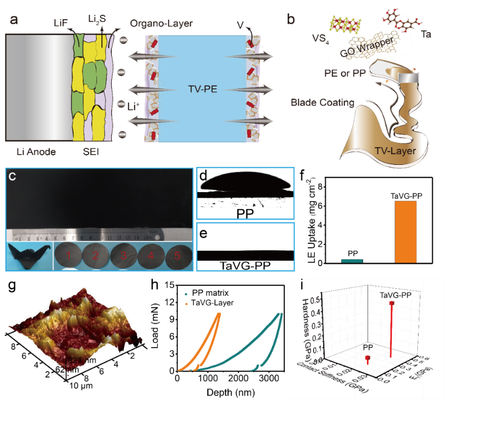 该团队采用简单的涂覆工艺将氧化石墨烯纳米片包裹的硫化钒和单宁酸功能涂层均匀的负载到商用聚烯烃隔膜上。该功能涂层单面厚度仅为1.5 μm左右,涂层载量仅为0.15 mg cm-2左右(远低于商用勃姆石涂层的负载量),具有良好的力学性能,且能够实现大面积制备。该复合隔膜能够保证金属锂负极实现了6000小时稳定循环以及金属锂负极表面致密平整的沉积状态。理论模拟结果表明:复合隔膜能够保证锂负极表/界面处离子和电场均匀分布,实现锂离子的均匀输运和沉积,进而削弱缺陷处的沉积放大效应,避免锂枝晶和死锂的产生。进一步采用XPS深剖技术解析了SEI的化学组成,证实了功能隔膜对金属锂负极表面的调控作用。DFT计算证明了功能涂层组分对硫正极侧多硫化物的协同催化作用。最后,基于该复合隔膜组装的金属锂电池实现了稳定循环,并展示了软包锂电池驱动小型电动机器人的应用。与此同时,该功能涂层还可赋予复合隔膜良好的耐热性,可显著提升金属锂电池的安全性,具有广泛的应用前景。